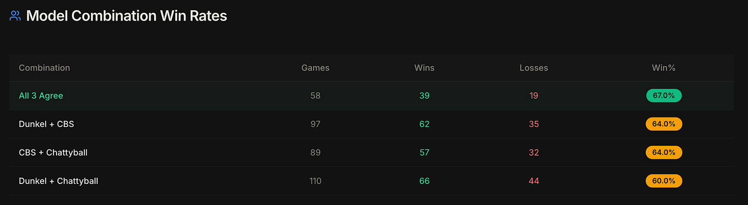 These figures highlight the power of consensus: when all three models—Dunkel (a time-tested rating system), CBS (drawing from CBS Sports analytics), and Chattyball (an innovative, AI-enhanced predictor)—align, the win rate jumps to 67%. Even pairwise agreements hover around 60-64%, outperforming random chance and providing bettors with actionable insights.