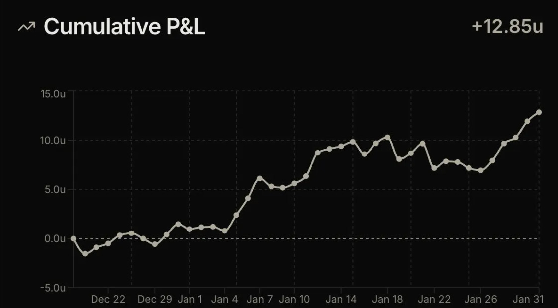 [](https://substackcdn.com/image/fetch/$s_!XYNR!,f_auto,q_auto:good,fl_progressive:steep/https%3A%2F%2Fsubstack-post-media.s3.amazonaws.com%2Fpublic%2Fimages%2Ff02e7c31-51d2-4083-9e5b-4b24ffca02b5_1198x1114.png)The cumulative chart shows the kind of steady climb you want to see: a slow start through early January, then a breakout around the 5th-7th that pushed the bankroll past +5u, followed by consistent growth into mid-month territory around +10u. A brief pullback from Jan 19-26 tested the patience, but a strong close +1.0u, +1.7u, +0.6u, +1.6u, +0.9u over the final five days pushed the month to its peak.